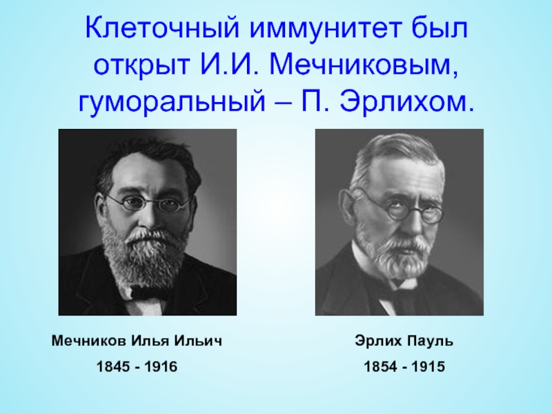 Слайд 23Клеточный иммунитет был открыт И.И. Мечниковым, гуморальный – П. Эрлихом.