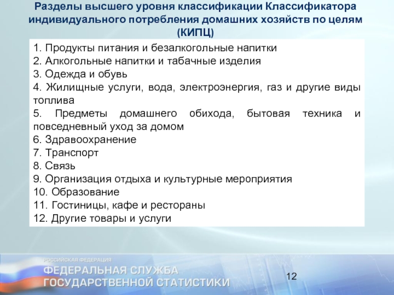 данные выборочного обследования бюджетов домашних хозяйств о структуре потребительских расходов домашних хозяйств, разрабатываемые по полной номенклатуре кодов Классификатора индивидуального потребления домашних хозяйств по целям (КИПЦ)