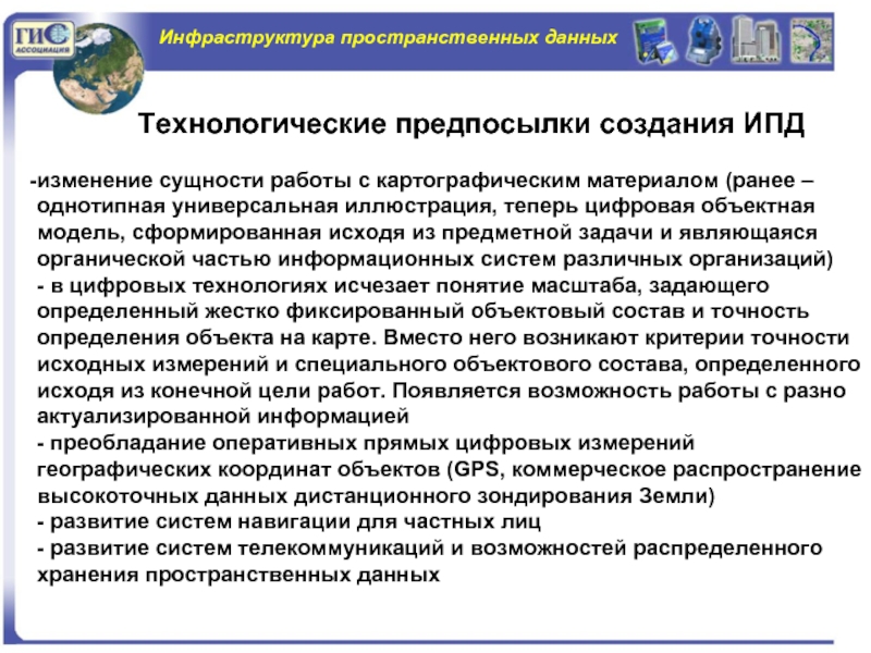 - развитие систем телекоммуникаций и возможностей распределенного хранения пространственных данных
