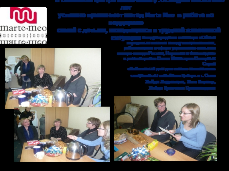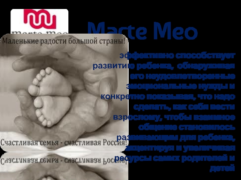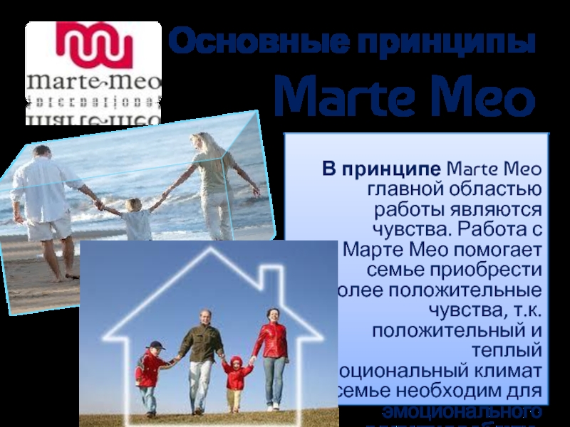 областью работы являются чувства. Работа с Марте Мео помогает семье приобрести более положительные чувства, т.к. положительный и теплый эмоциональный климат в семье необходим для эмоционального развития ребенка.