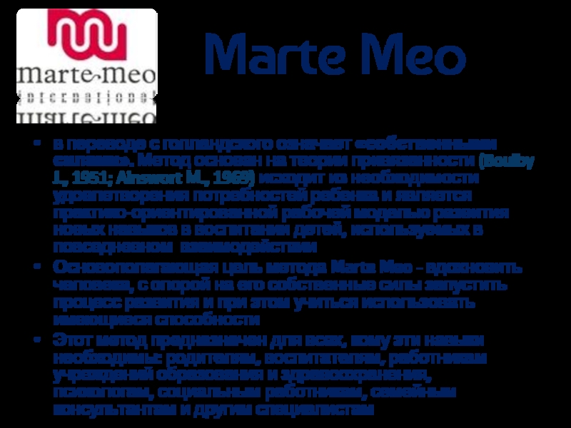 Основополагающая цель метода Marte Meo - вдохновить человека, с опорой на его собственные силы запустить процесс развития и при этом учиться использовать имеющиеся способности