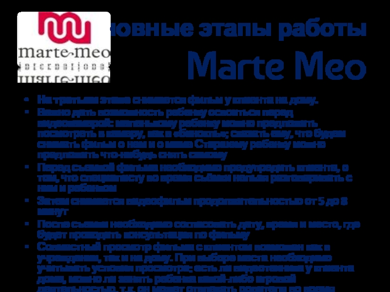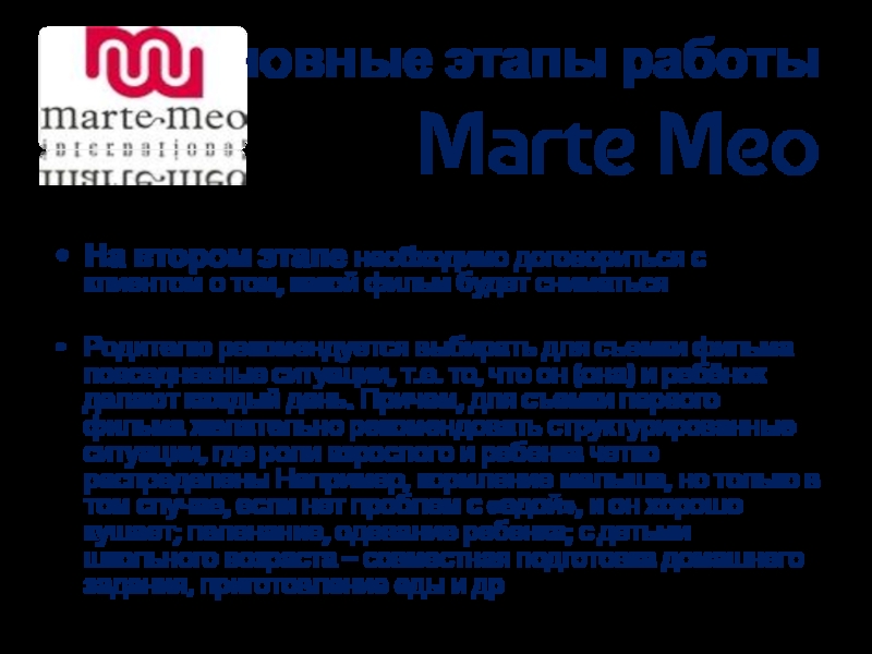 неоднократно просматривается и анализируется покадрово в двух направлениях: что получается, а что еще можно развить, учитывая при этом принципы Marte Meo; все это фиксируется в рабочем списке на основе «профессионального диагноза»