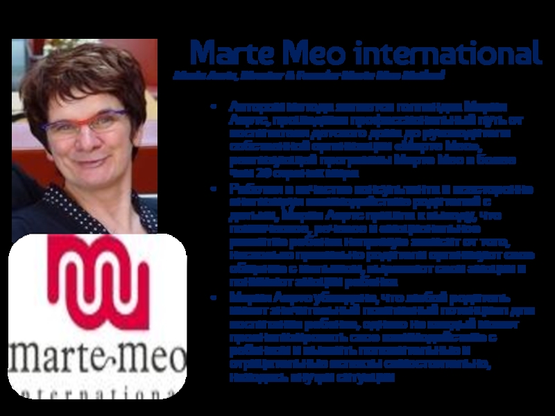 профессиональный путь от воспитателя детского дома до руководителя собственной организации «Марте Мео», реализующей программы Марте Мео в более чем 20 странах мира