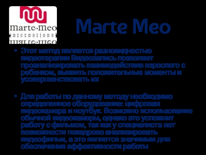 метод является разновидностью видеотерапии Видеозапись позволяет проанализировать взаимодействие взрослого с ребенком, выявить положительные моменты и усовершенствовать их