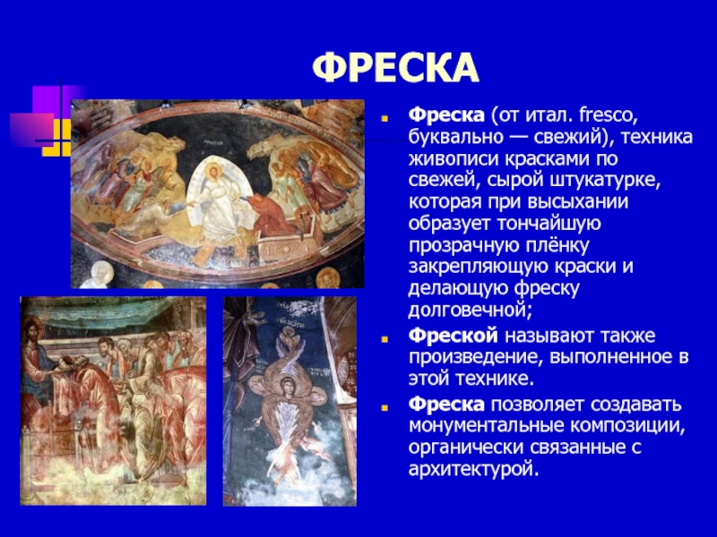 Фреска позволяет создавать монументальные композиции, органически связанные с архитектурой.