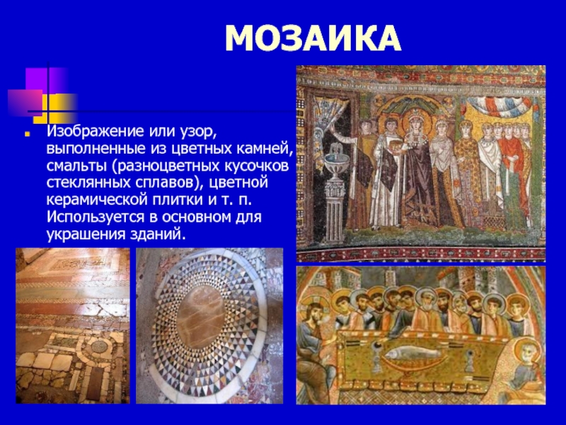 Изображение или узор, выполненные из цветных камней, смальты (разноцветных кусочков стеклянных