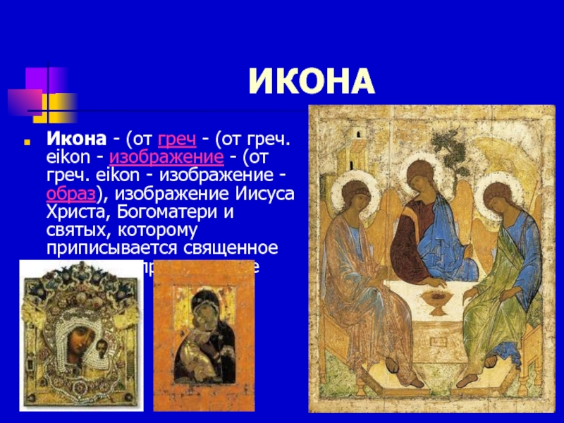 (от греч. eikon - изображение - образ), изображение Иисуса Христа, Богоматери и святых, которому приписывается священное значение, произведение иконописи.