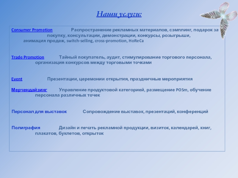 Consumer Promotion Распространение рекламных материалов, сэмплинг, подарок за покупку, консультации,