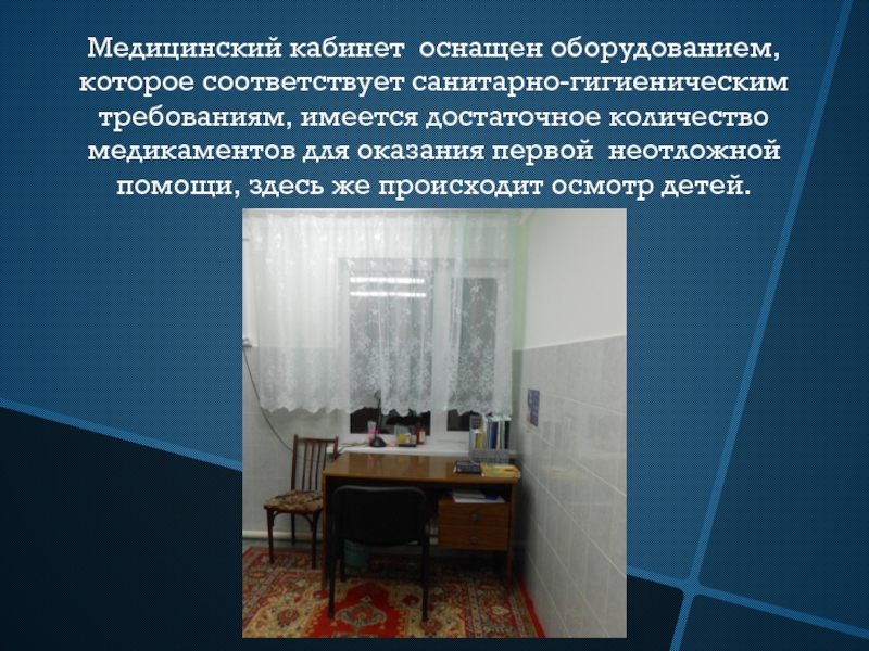 Слайд 27Медицинский кабинет оснащен оборудованием, которое соответствует санитарно-гигиеническим требованиям, имеется достаточное количество
