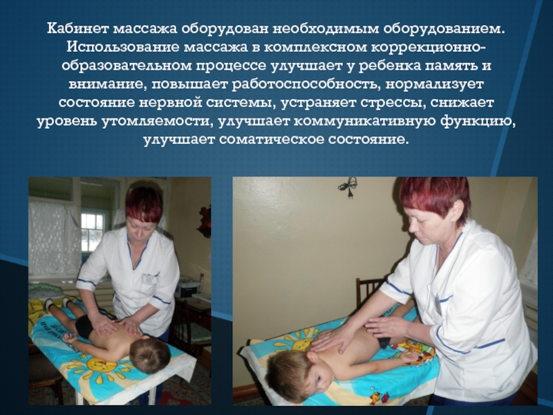 Слайд 28Кабинет массажа оборудован необходимым оборудованием. Использование массажа в комплексном коррекционно-образовательном процессе