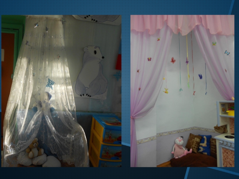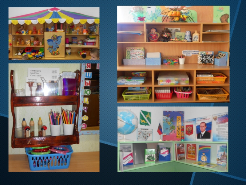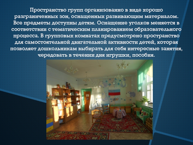 Слайд 5Пространство групп организованно в виде хорошо разграниченных зон, оснащенных развивающим материалом.