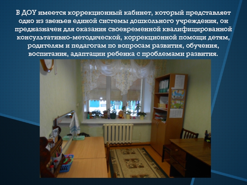 Слайд 25В ДОУ имеется коррекционный кабинет, который представляет одно из звеньев единой