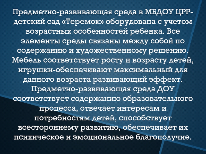 Слайд 3Предметно-развивающая среда в МБДОУ ЦРР- детский сад «Теремок» оборудована с учетом