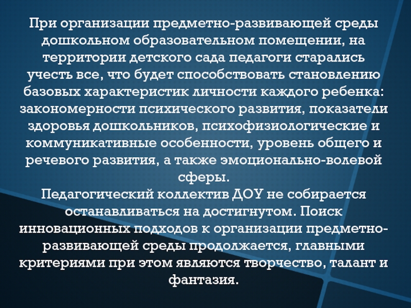 Педагогический коллектив ДОУ не собирается останавливаться на достигнутом. Поиск инновационных подходов к организации предметно-развивающей среды продолжается, главными критериями при этом являются творчество, талант и фантазия.