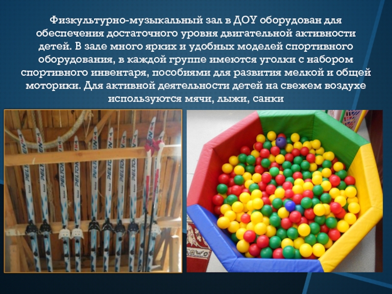 Слайд 21Физкультурно-музыкальный зал в ДОУ оборудован для обеспечения достаточного уровня двигательной активности