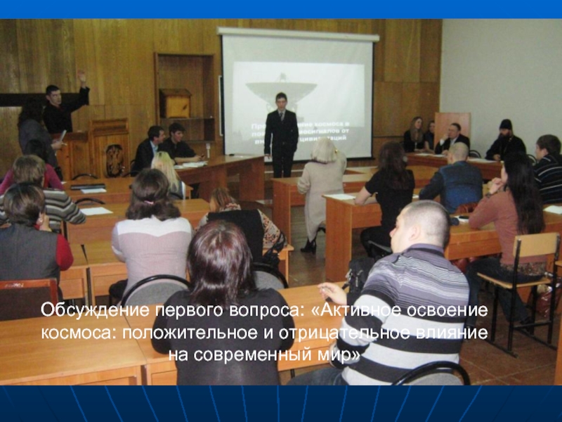 Слайд 34Обсуждение первого вопроса: «Активное освоение космоса: положительное и отрицательное влияние на