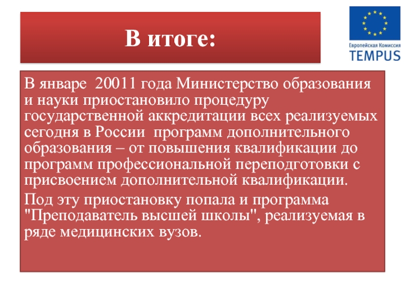 В январе 20011 года Министерство образования и науки приостановило процедуру