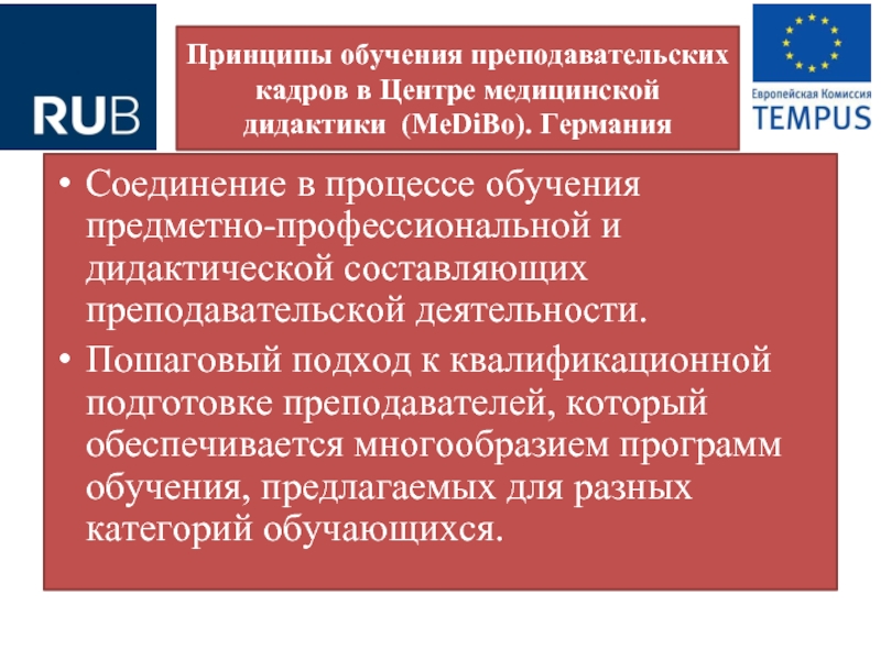 Слайд 11Принципы обучения преподавательских кадров в Центре медицинской дидактики (MeDiBo). Германия