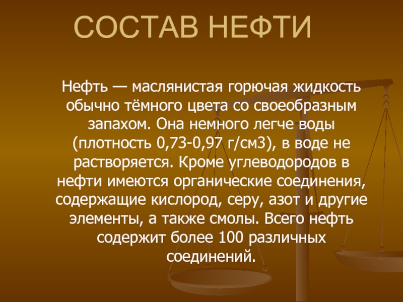 Нефть — маслянистая горючая жидкость обычно тёмного цвета со своеобразным