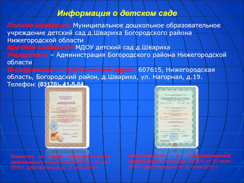Свидетельство о государственной аккредитации: серия ДД 017074 от 26 июля 2010 г. действительно по 30 июня 2013 г.