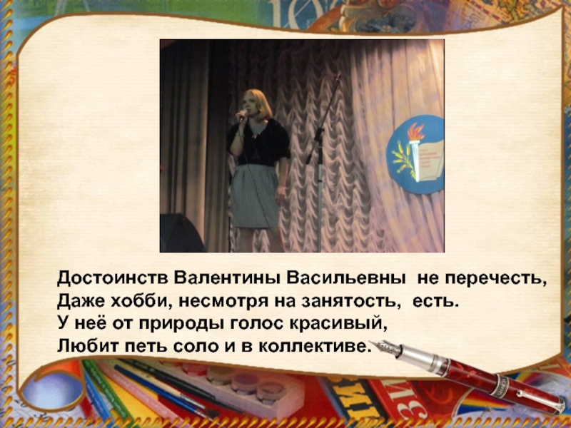 Слайд 9Достоинств Валентины Васильевны не перечесть,