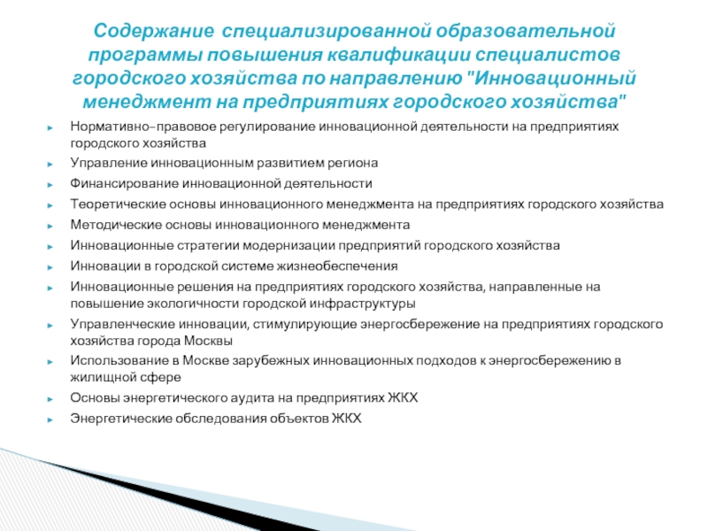 Содержание специализированной образовательной программы повышения квалификации специалистов городского хозяйства по направлению "Инновационный менеджмент на предприятиях городского хозяйства"