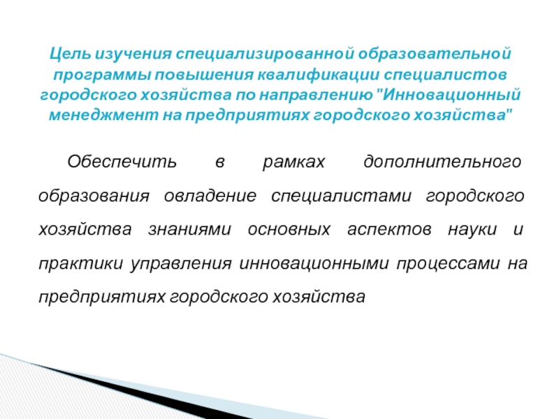 Обеспечить в рамках дополнительного образования овладение специалистами городского хозяйства знаниями основных аспектов науки и практики управления инновационными процессами на предприятиях городского хозяйства