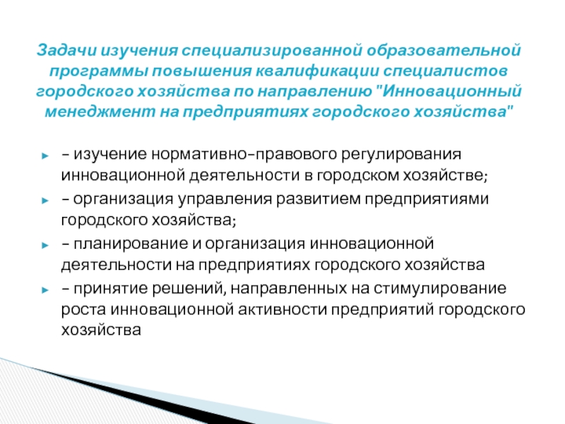 Задачи изучения специализированной образовательной программы повышения квалификации специалистов городского хозяйства по направлению "Инновационный менеджмент на предприятиях городского хозяйства"