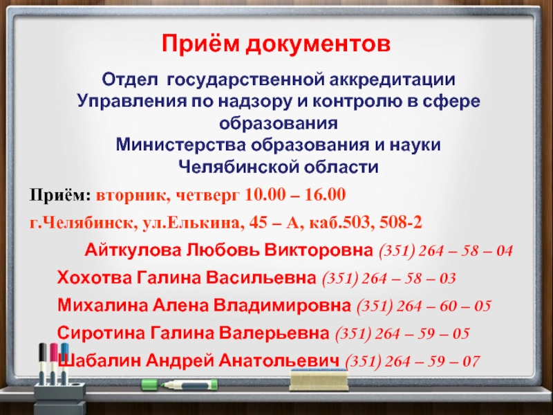 г.Челябинск, ул.Елькина, 45 – А, каб.503, 508-2