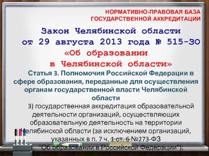 3) государственная аккредитация образовательной деятельности организаций, осуществляющих образовательную деятельность на территории Челябинской области (за исключением организаций, указанных в п. 7 ч. 1 ст. 6 №273-ФЗ