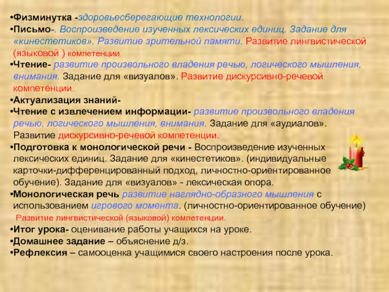Фонетическая зарядка– чтение стихотворения и произнесение некоторых звуков и слов, которые будут использоваться на уроке. Развитие наглядно-образного мышления. Задание для «визуалов». Развитие лингвистической (языковой) компетенции.