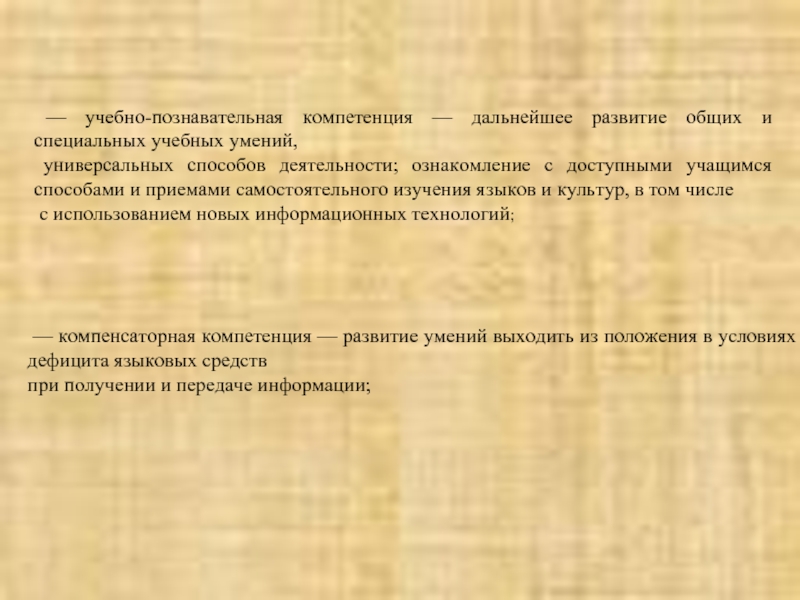 — учебно-познавательная компетенция — дальнейшее развитие общих и специальных учебных умений,