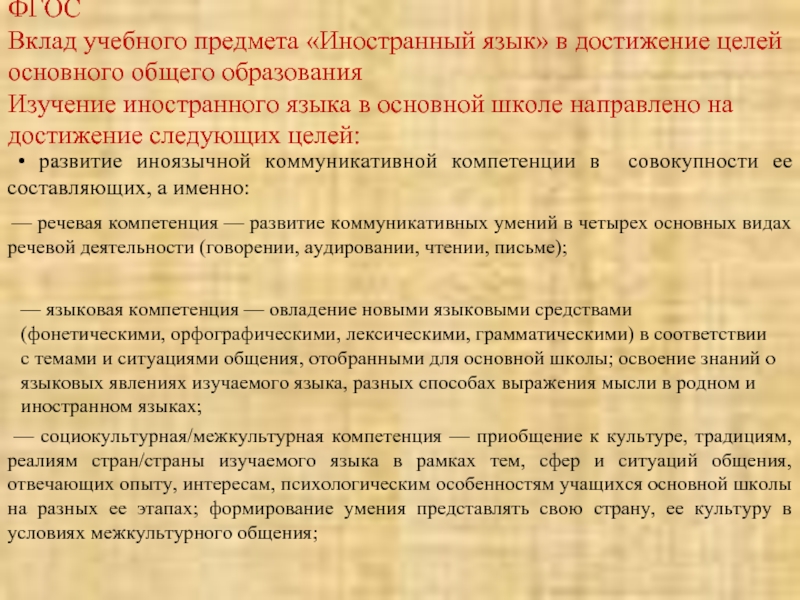 — социокультурная/межкультурная компетенция — приобщение к культуре, традициям, реалиям стран/страны изучаемого языка в рамках тем, сфер и ситуаций общения, отвечающих опыту, интересам, психологическим особенностям учащихся основной школы на разных ее этапах; формирование умения представлять свою страну, ее культуру в условиях межкультурного общения;