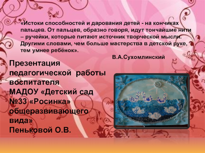 «Истоки способностей и дарования детей - на кончиках пальцев. От пальцев, образно говоря, идут тончайшие нити – ручейки, которые питают источник творческой мысли. Другими словами, чем больше мастерства в детской руке, тем умнее ребёнок».