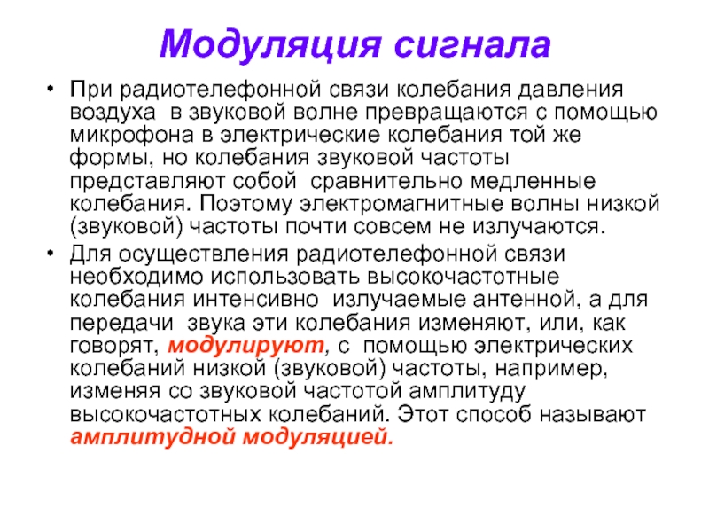 Для осуществления радиотелефонной связи необходимо использовать высокочастотные колебания интенсивно излучаемые антенной, а для передачи звука эти колебания изменяют, или, как говорят, модулируют, с помощью электрических колебаний низкой (звуковой) частоты, например, изменяя со звуковой частотой амплитуду высокочастотных колебаний. Этот способ называют амплитудной модуляцией.