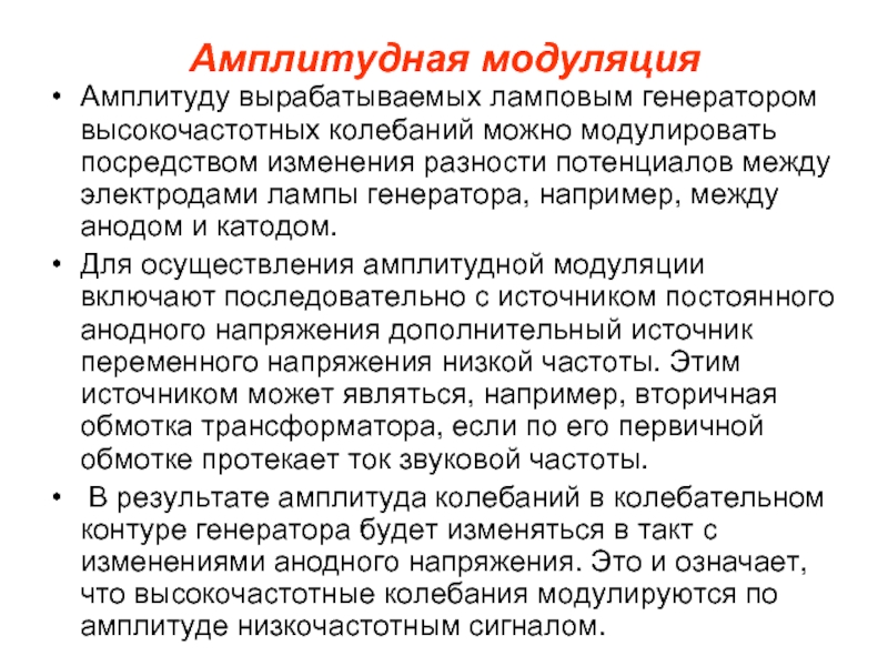 Для осуществления амплитудной модуляции включают последовательно с источником постоянного анодного напряжения дополнительный источник переменного напряжения низкой частоты. Этим источником может являться, например, вторичная обмотка трансформатора, если по его первичной обмотке протекает ток звуковой частоты.