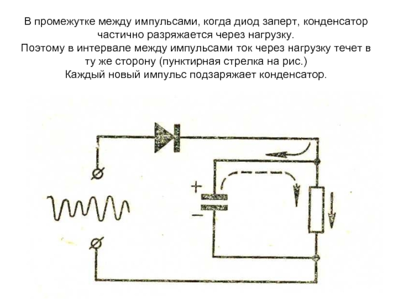 Слайд 27В промежутке между импульсами, когда диод заперт, конденсатор частично разряжается через