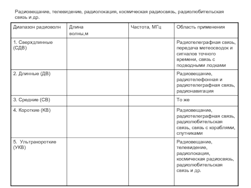 Слайд 33Радиовещание, телевидение, радиолокация, космическая радиосвязь, радиолюбительская связь и др.