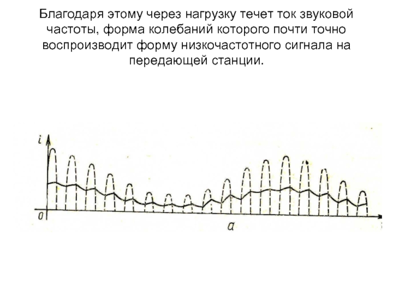 Слайд 28Благодаря этому через нагрузку течет ток звуковой частоты, форма колебаний которого