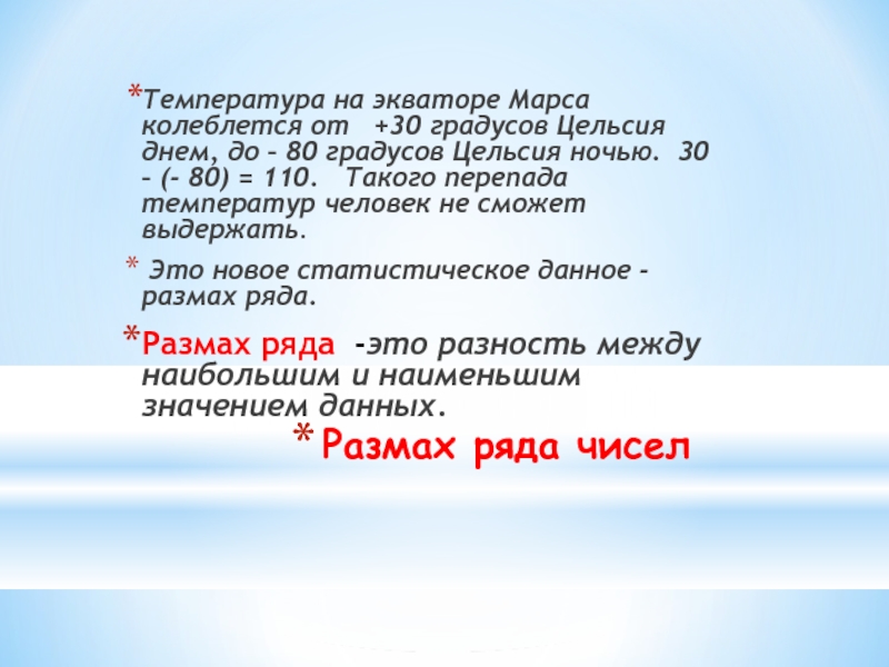 Цельсия днем, до – 80 градусов Цельсия ночью. 30 – (- 80) = 110. Такого перепада температур человек не сможет выдержать.