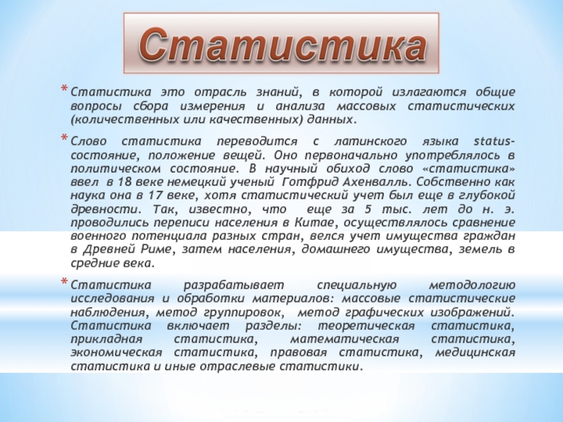 Статистика это отрасль знаний, в которой излагаются общие вопросы сбора измерения