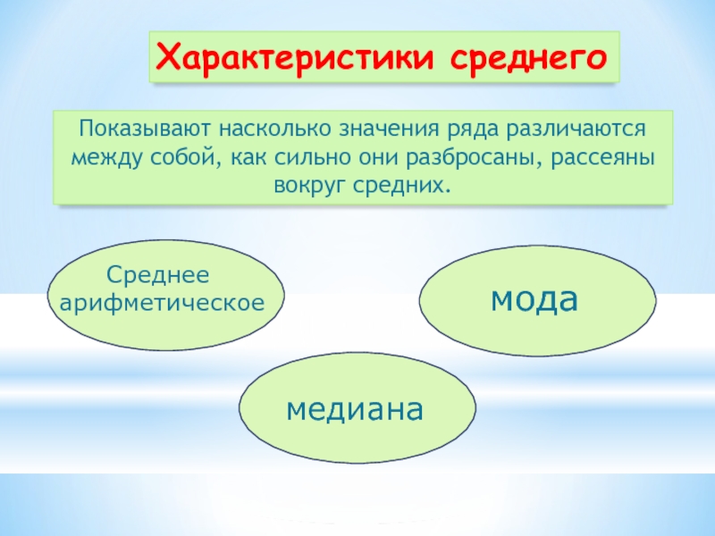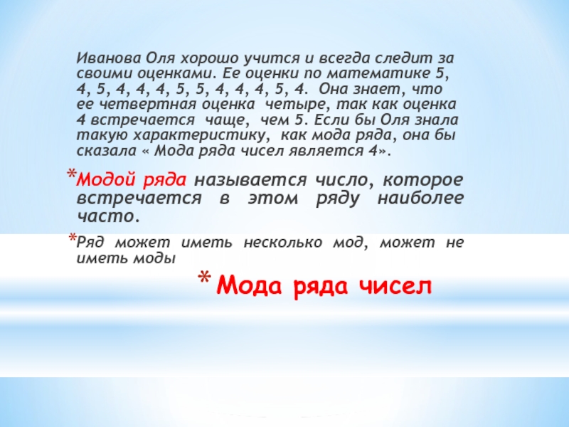 оценками. Ее оценки по математике 5, 4, 5, 4, 4, 4, 5, 5, 4, 4, 4, 5, 4. Она знает, что ее четвертная оценка четыре, так как оценка 4 встречается чаще, чем 5. Если бы Оля знала такую характеристику, как мода ряда, она бы сказала « Мода ряда чисел является 4».