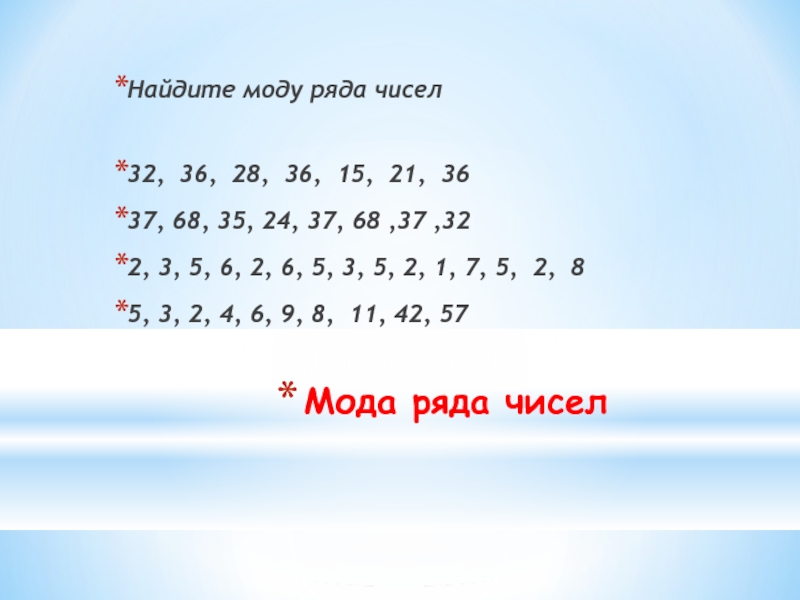 Слайд 14Для каждого ряда чисел найти среднее арифметическое, размах, моду и медиану.