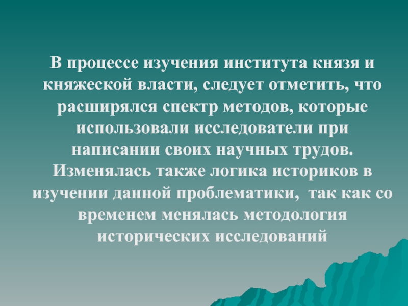 На протяжении второй половины XIX – начала XX вв., исходило из того, что в общинно – вечевом устройстве Древней Руси князь и княжеская власть занимала одинаковое положение с другими политическими институтами (вече, дружина) (И.Д. Беляев, Н.И. Костомаров, В.И. Сергеевич, А.Е. Пресняков)