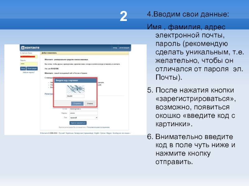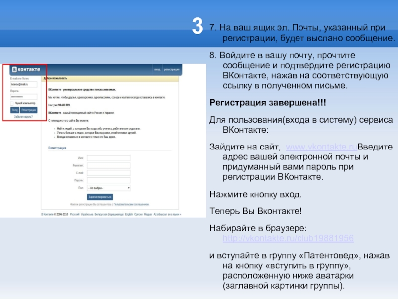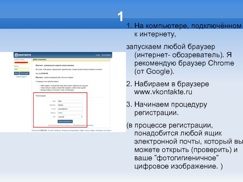 Слайд 1Инструкция по регистрации на сайте vkontakte.ru