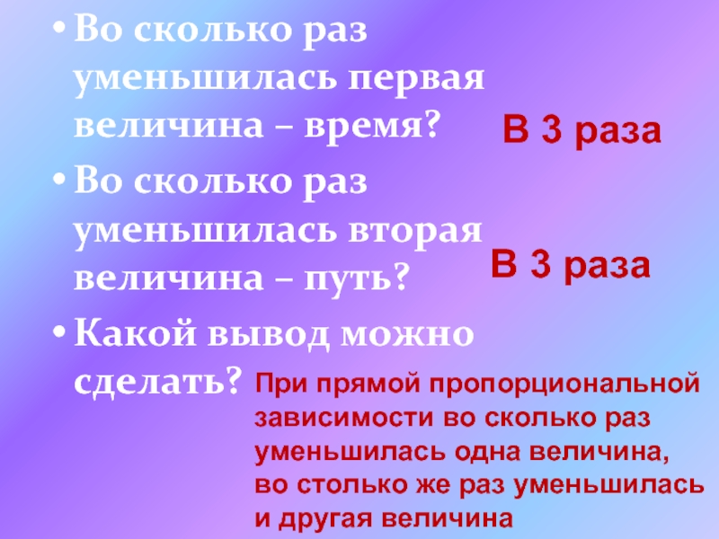 При прямой пропорциональной зависимости во сколько раз уменьшилась одна величина, во столько же раз уменьшилась и другая величина