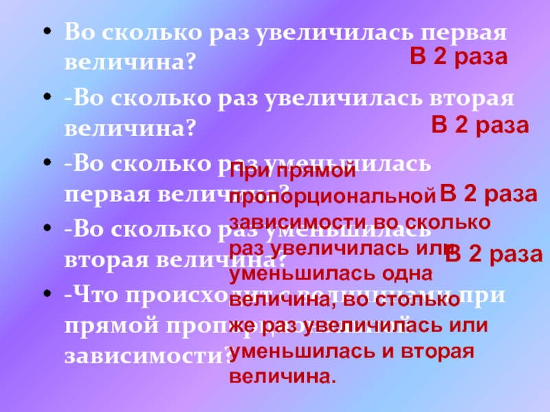 При прямой пропорциональной зависимости во сколько раз увеличилась или уменьшилась одна величина, во столько же раз увеличилась или уменьшилась и вторая величина.