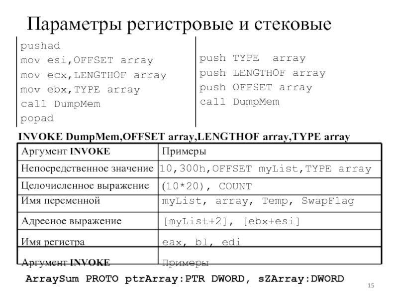 Непосредственное значение 10,300h,OFFSET myList,TYPE array