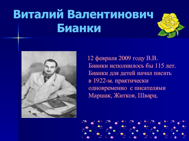 Для ребят, для взрослых, для всех – так писал Виталий Валентинович Бианки (1894 – 1959 гг.). По мнению его ученика, друга и писателя-натуралиста Николая Ивановича Сладкова, В. В. Бианки имел «лесное ухо». Лесное ухо из хаоса звуков умело выделить самое главное, самое интересное, самое важное и нужное. Оно никогда не дремало, оно было всегда начеку: в поле, в лесу, у костра, в жизни… Главная тема его произведений – лес и его обитатели.