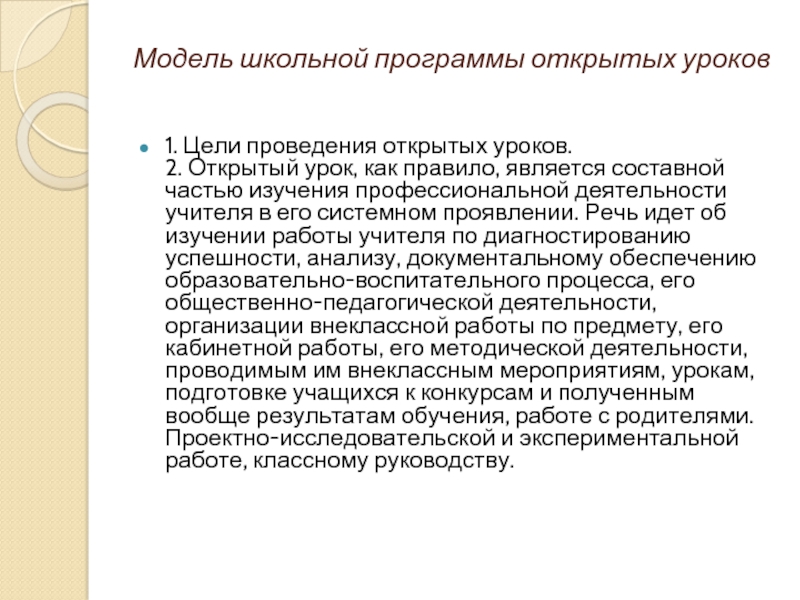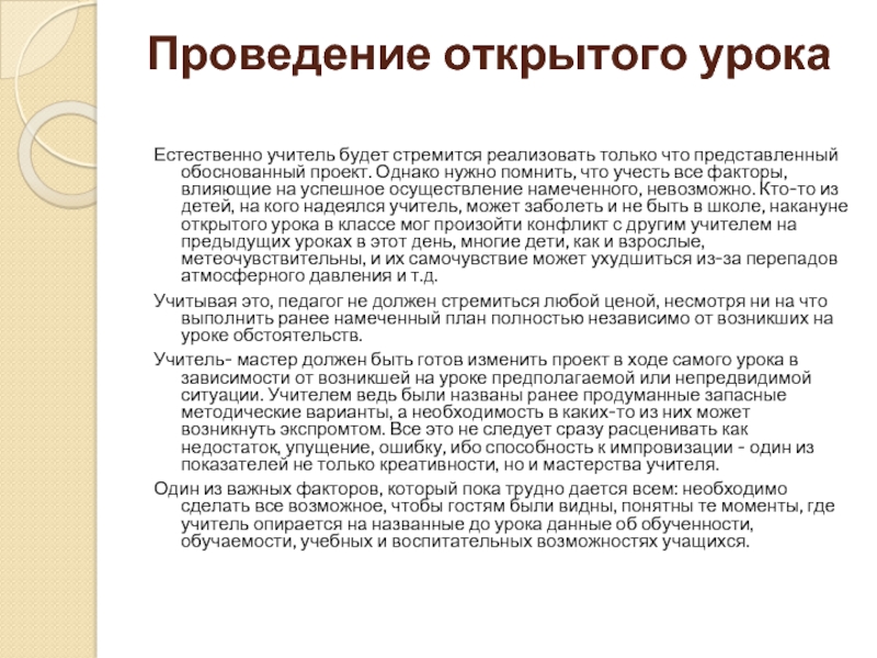 проект. Однако нужно помнить, что учесть все факторы, влияющие на успешное осуществление намеченного, невозможно. Кто-то из детей, на кого надеялся учитель, может заболеть и не быть в школе, накануне открытого урока в классе мог произойти конфликт с другим учителем на предыдущих уроках в этот день, многие дети, как и взрослые, метеочувствительны, и их самочувствие может ухудшиться из-за перепадов атмосферного давления и т.д.
